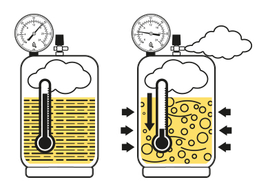 Point d’ébullition : c’est la température en dessous de laquelle le GPL ne se vaporise pas. Celui du propane commercial est d’environ -42°C et celui du butane commercial d’environ -2°C. En situation de froid, le butane commercial ne peut pas être utilisé à l’extérieur. En revanche, le propane commercial convient pour des applications telles que chauffage, cuisine et usages industriels. Dans une bouteille, le GPL est liquide en bas et en vapeur sous pression en haut. Lorsqu’il y a un soutirage de gaz, le volume de gaz est régénéré par l’ébullition de la partie liquide. Cette vaporisation refroidit le liquide.